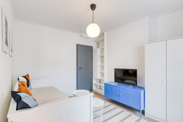 L'appartement dispose d'une chambre spacieuse baignée de lumière, grâce à de grandes fenêtres qui offrent une vue dégagée sur le quartier paisible. Le séjour, au design épuré et agrémenté de touches de couleur, crée une atmosphère chaleureuse et moderne. La cuisine, fonctionnelle et bien aménagée, s'ouvre sur le salon, proposant ainsi un espace de vie convivial et aéré.